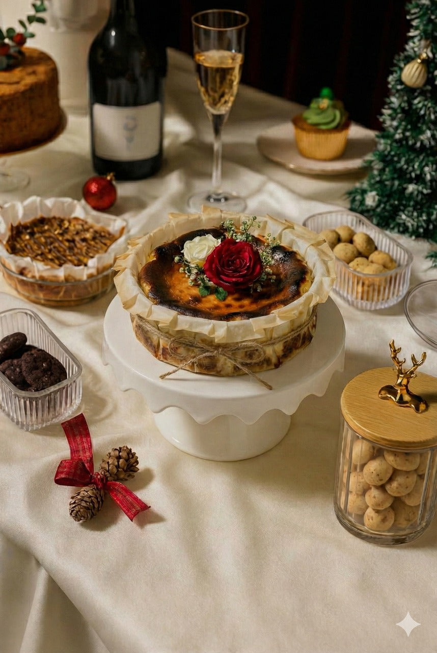 Bright, aromatic, and beautifully festive; this cheesecake brings a lively sparkle to your holiday table. A creamy burnt cheesecake base is swirled with our house-made cranberry–orange compote, slow-simmered with warm spices until glossy and fragrant.